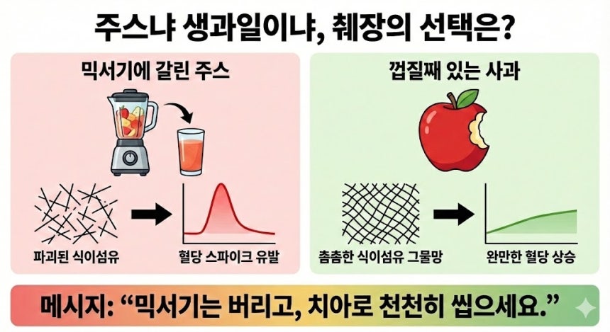 그는 “믹서기에 가는 순간 식이섬유 그물망은 파괴되고, 과일은 그저 ‘설탕물’로 돌변해 혈당 스파이크를 일으킨다”며 “과일은 마시는 게 아니라 반드시 씹어 먹어야 하는 음식”이라고 강조했다.